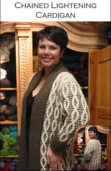 This is a beautiful slip-stitch pattern cardigan. The lightest natural colored cable yarn travels over an ever changing background. We chose natural colored yarn for the background from dark brown at the hips gradually changing the colors to the lightest color at the shoulders while the light cable stays the same throughout. The shawl collar is very easy to knit.