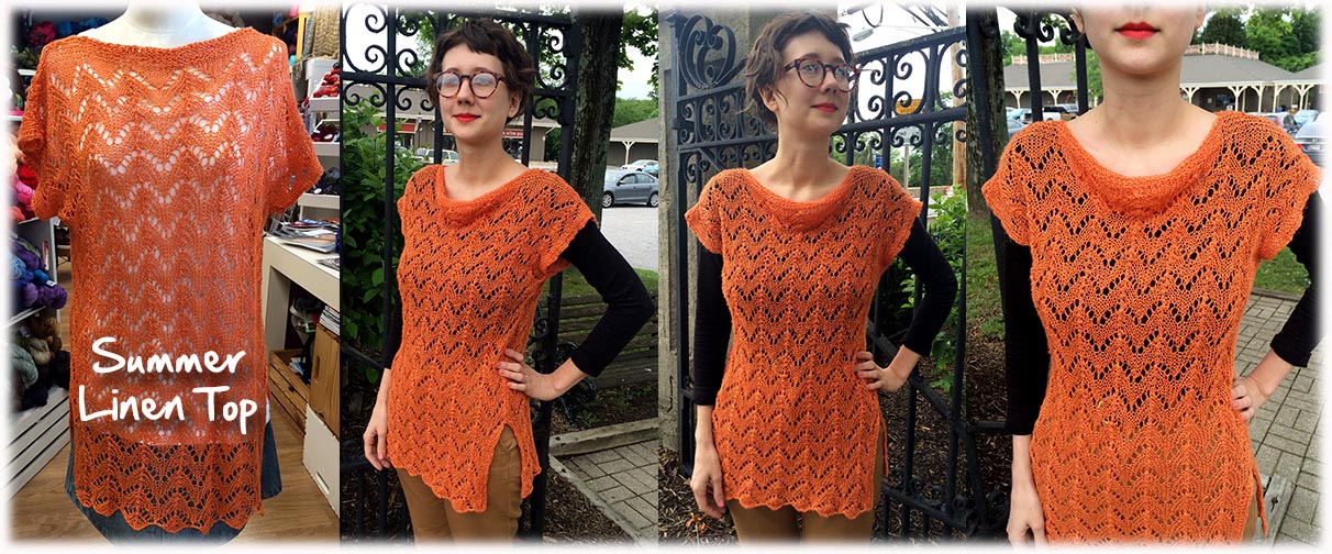 This is an easy lace pattern with a draped neck style and cap sleeves. There's nothing like linen. It flows so beautifully as this fiber has been around for centuries. Wear it with a tank top underneath and summer will never be too hot. Other yarns could also be used such as cotton, but just make sure you get the gauge as described.